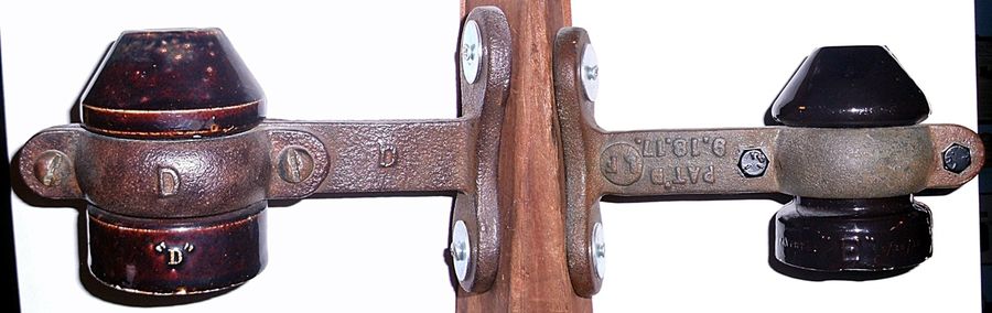 I love these pieces. Just the shape of them makes them attractive. These are Louis Fort Insulators. I was fortunate enough to aquire two different styles of them. The first one is the D model with a bigger hole. the second is a E model which used a standard wire hole. It is also less beefier and lighter insulator. Both of these fall under patent US 1,240,330- 9/18/1917 for streetlight applications. I've seen some of these in attractive colors of brown but have no idea as to who made the porcelain parts for Louis Fort Co. |
