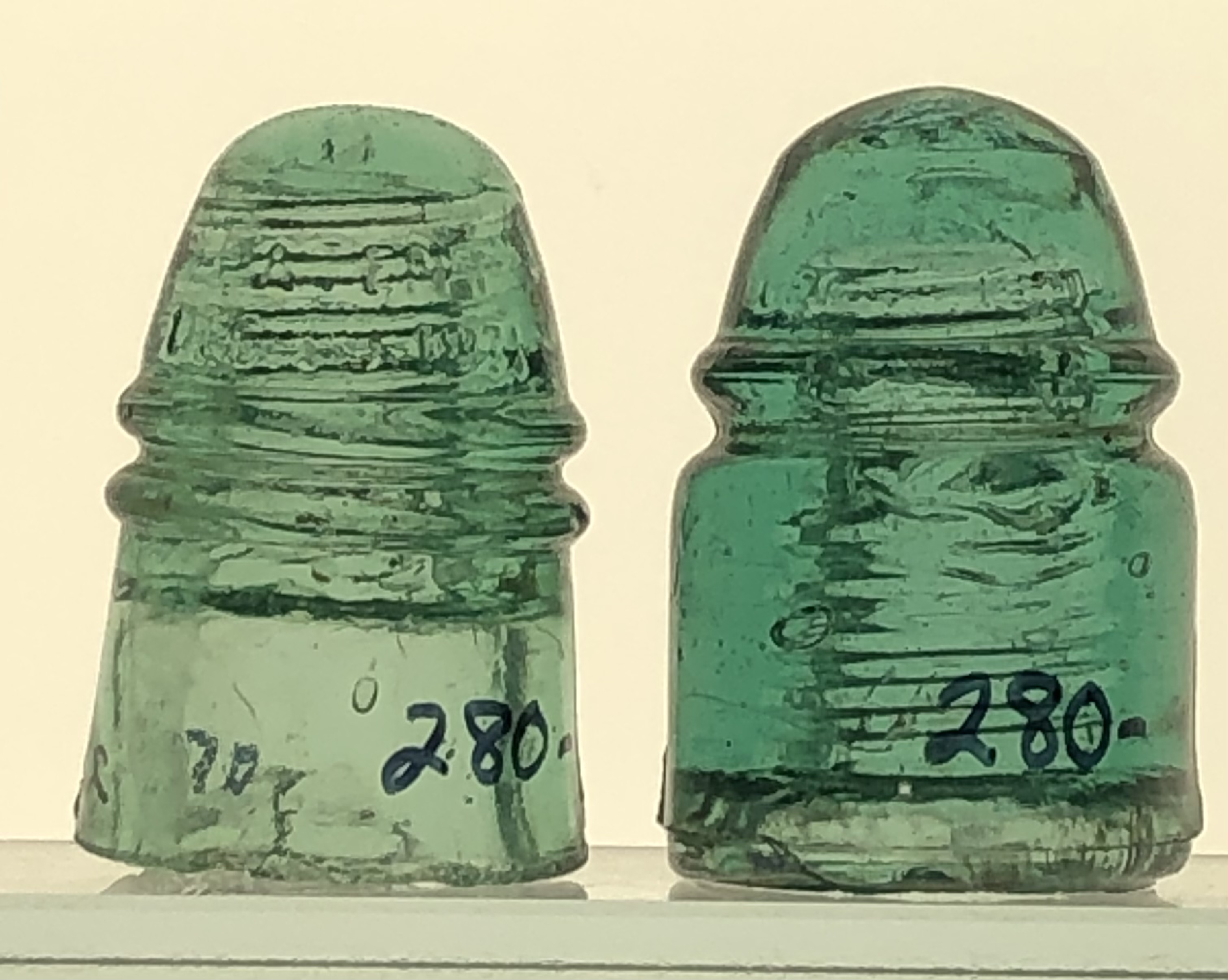 CD124.2 and 124.3 in pretty good shape. Only have two of the .2's out of the 6 I picked up. The .3 is one of the best condition out of the group I picked up. These guys are pretty tough! Left one is a Light Green Aqua and is the large style embossing. It has some flea bites and a rice sized lower wire ridge nick. Half the base is flat and half has an overpour and there are a few shallow base flakes. $280 shipped Right one is straight Aqua. It has a flea ding on the dome and some tiny flaking on the inside edge of the skirt. B skirt letter on back. $280 shipped Buy the pair for $515 shipped! |
