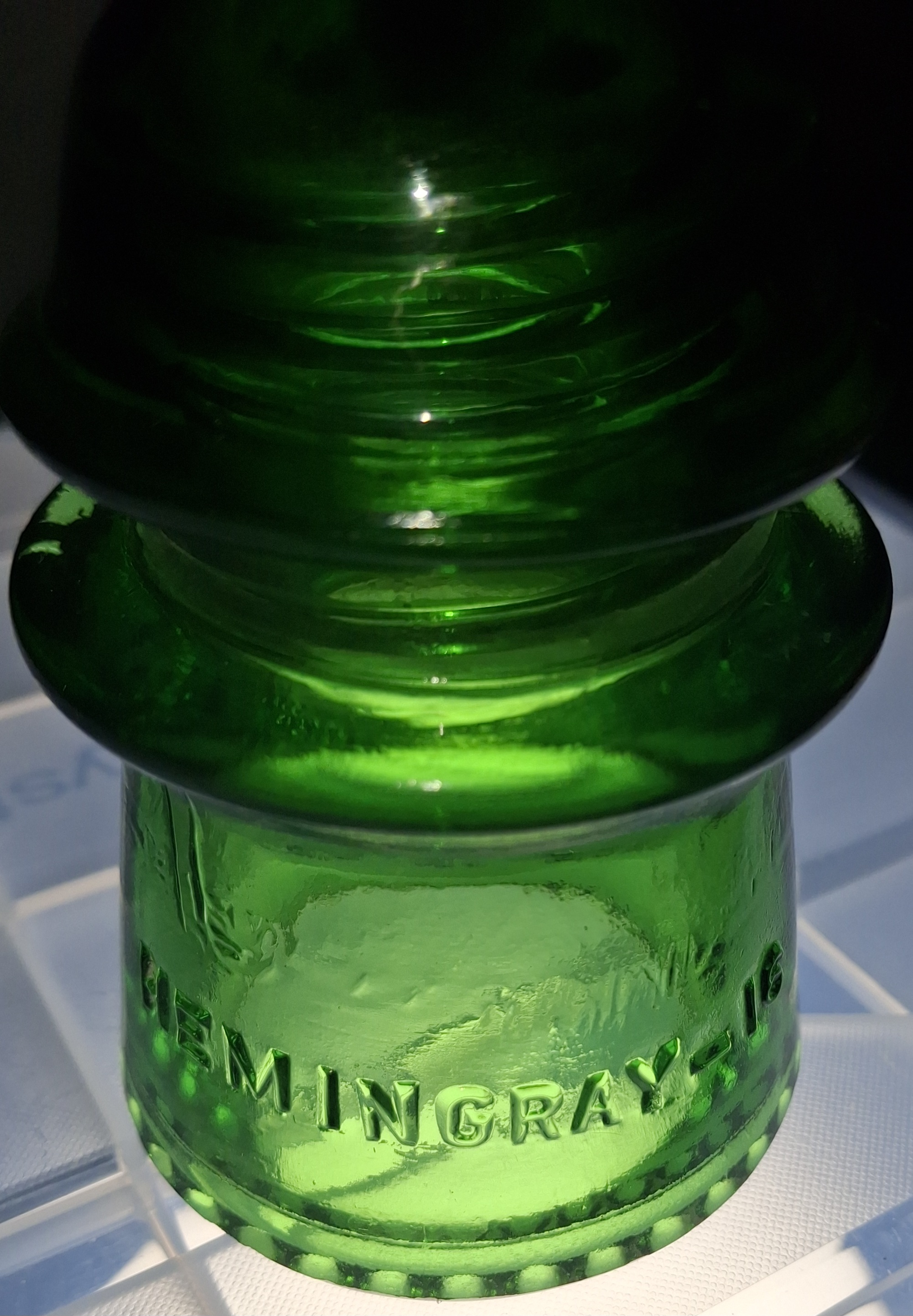 CD-122 7up Green Hemingray with ghost embossing above Hemingray, Il see scuffing of the wire groove $49 plus shipping