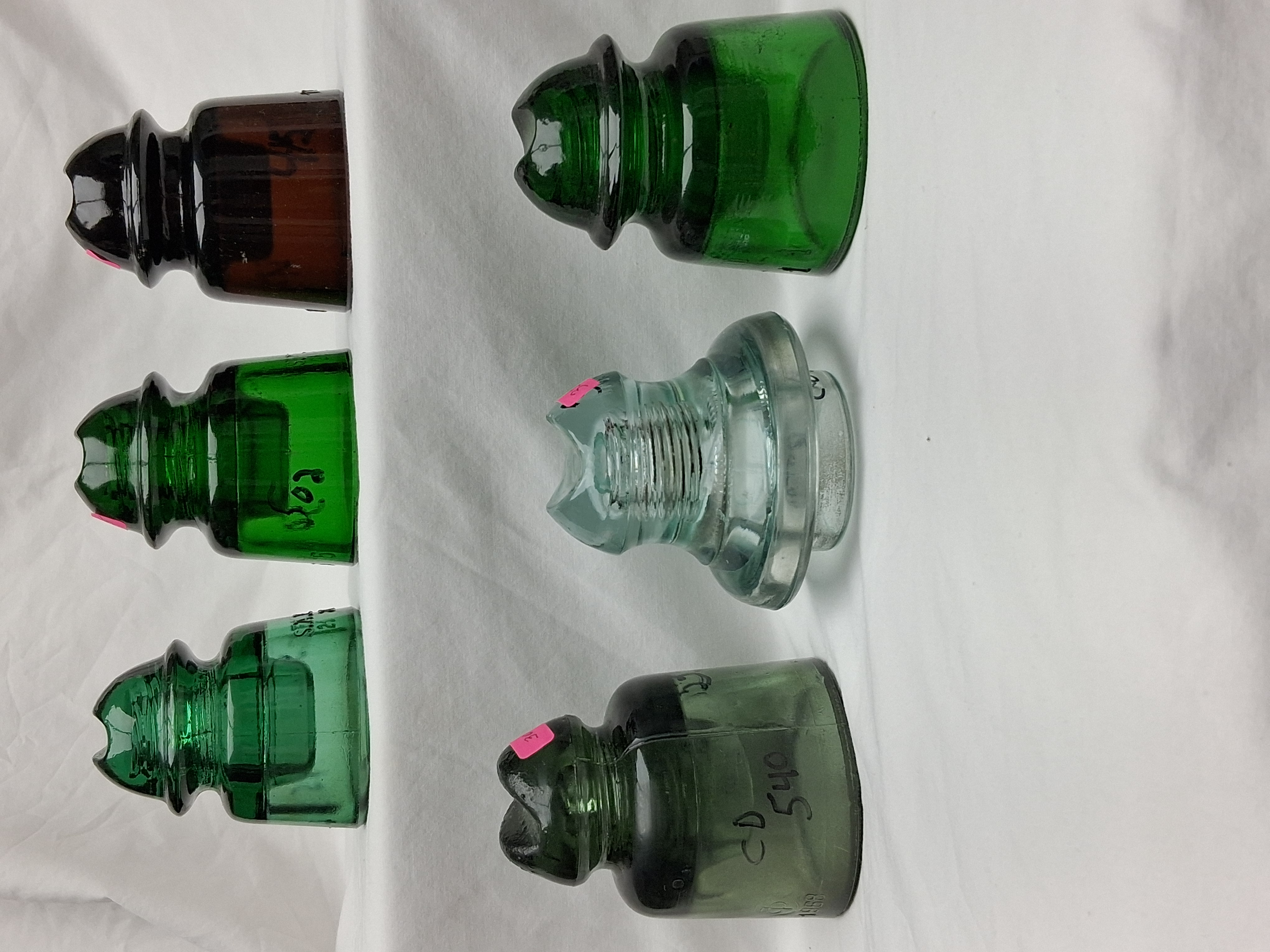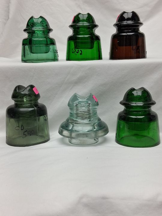 Back row left to right CD 502 Green mint SAFNV / 21 $40 CD 502 Great yellow green SAFNV/21 MINT $40 CD 502 Amber INV / 21 MINT $40 Front row left to right CD 540 Russian Good shape $25 CD 600 chip on side of top wire groove Germany $25 CD 502 Uruguay N over V / 21 $40 Price plus shipping. First E-Mail PayPal to my E-Mail address. Thanks! Don |