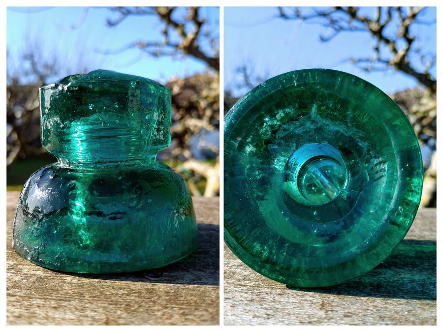 My latest find is this CD 607.7, a very thick, solid, and heavy piece of glass, almost like a solid pour type of insulator, if that's the right word. Interestingly, the entry/bottom diameter of the pin hole is narrower than the threaded portion, which is wider. Is this a result or a practical necessity of the mounting technique, which often used cement glue to secure the metal hook? Regardless, it's an interesting addition to the collection. |