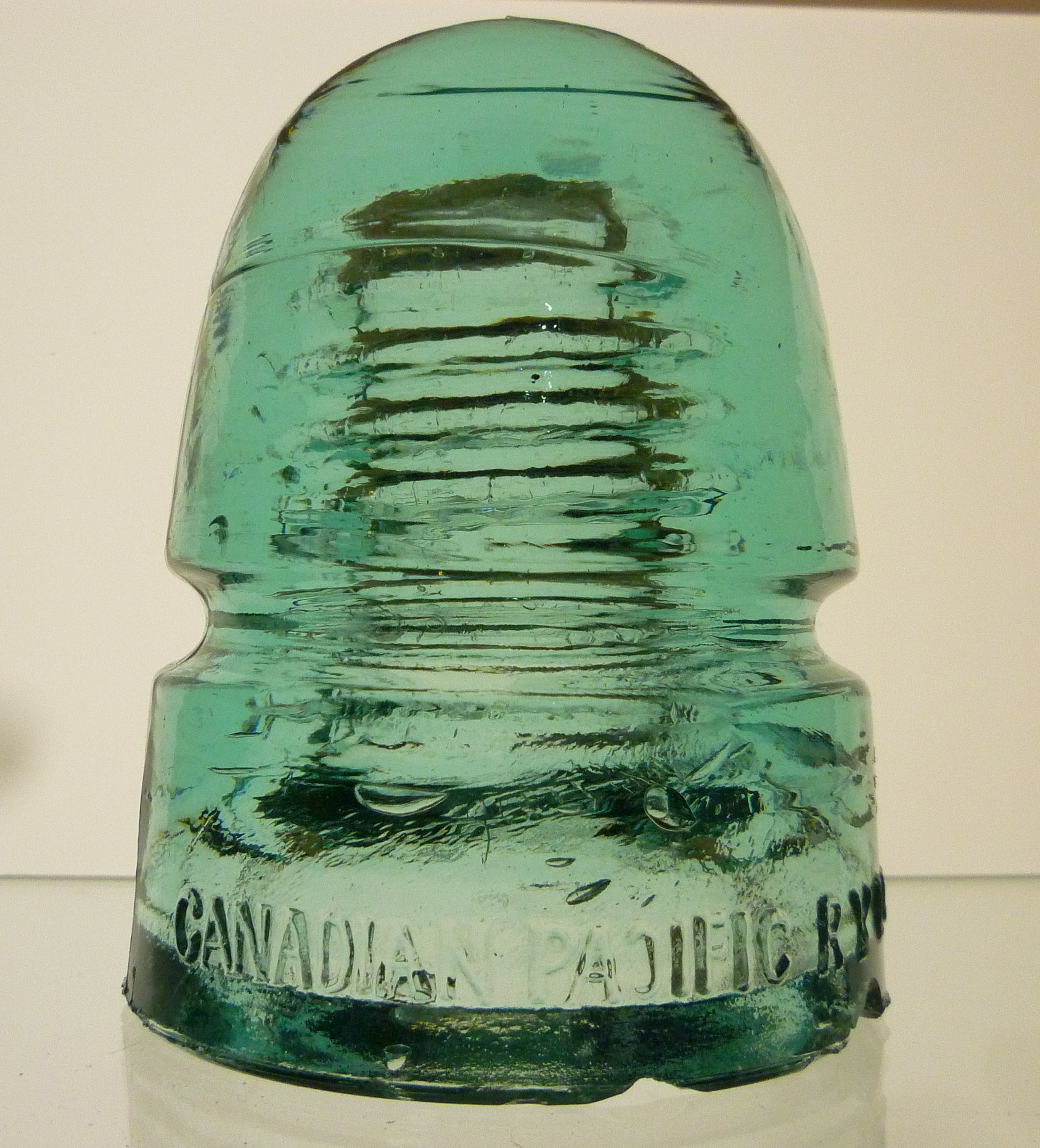 CD 143 CANADIAN PAϽIFIC RY CO telegraph insulator [070] Front skirt embossed: CANADIAN PAϽIFIC RY CO (Note 1st "C" in PACIFIC is backwards ) MLOD – Mold line over dome Smooth base Light yellowish green Couple minor base flakes. Nothing too drastic. $20.00 + shipping Stock #a4170 |