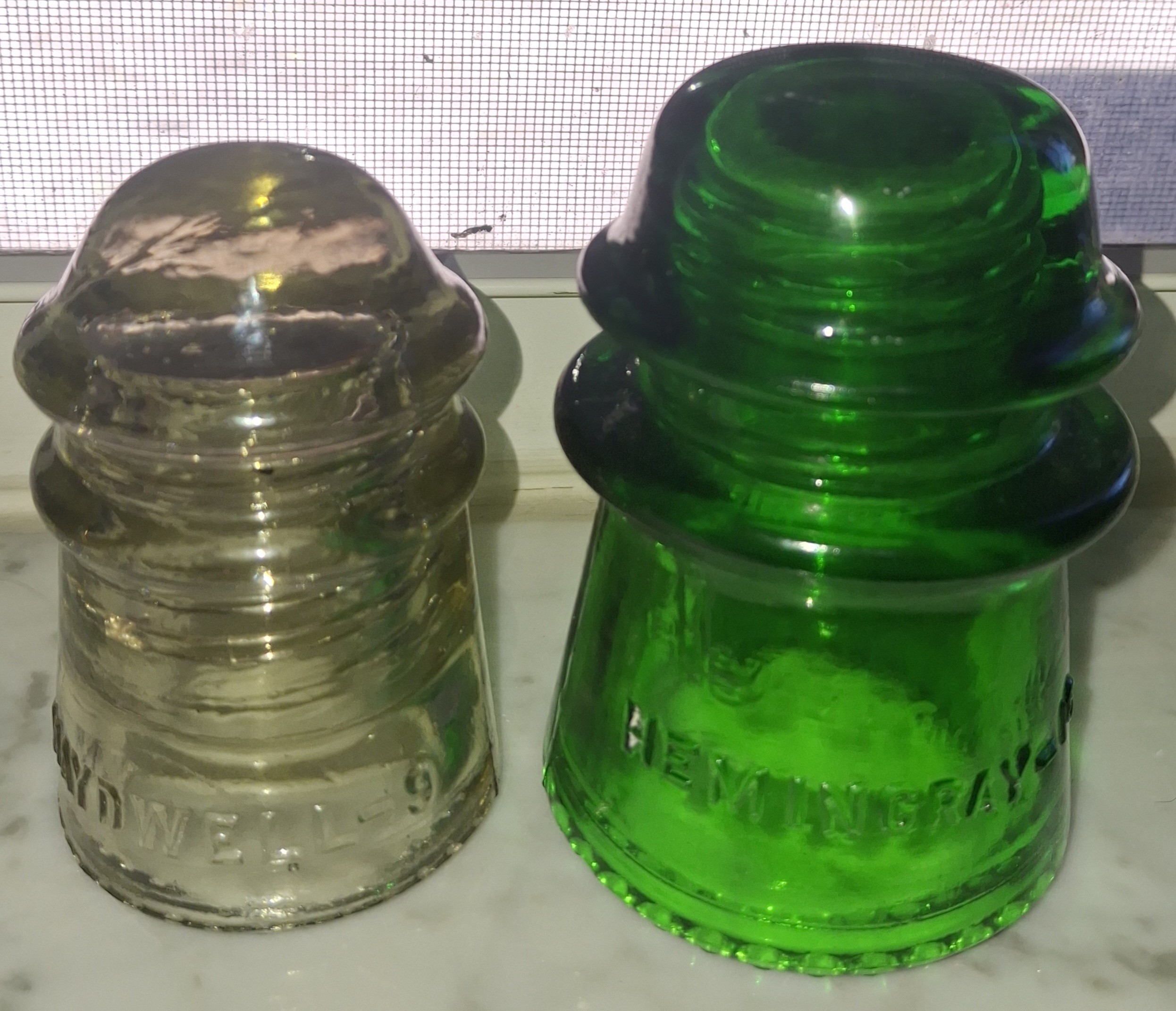 CD-122 7up Green Hemingray with ghost embossing above Hemingray, I see mild scuffing of the wire groove. Sale $30 plus shipping CD-106 Maydwell-9 on a pretty medium-Ginger Ale color, I see a scratch on top of the dome and on the front skirt. Sale $25 plus shipping Thanks for looking. More photos on request. Payment: VENMO, Zelle, PayPal F&F, or personal check |