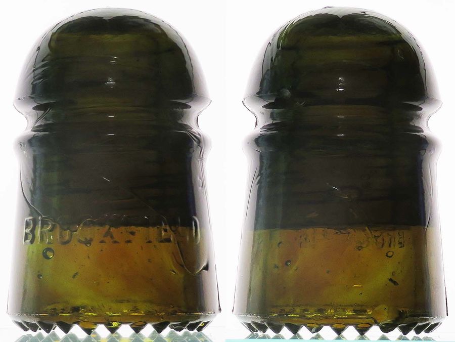 CD 102 (crown) "backwards 17" (skirt) BROOKFIELD -- SDP -- fantastic amber/olive tiger striped! small base chip on back affects one drip and a couple others have flaked tips (see picture) -- $175 plus actual postage