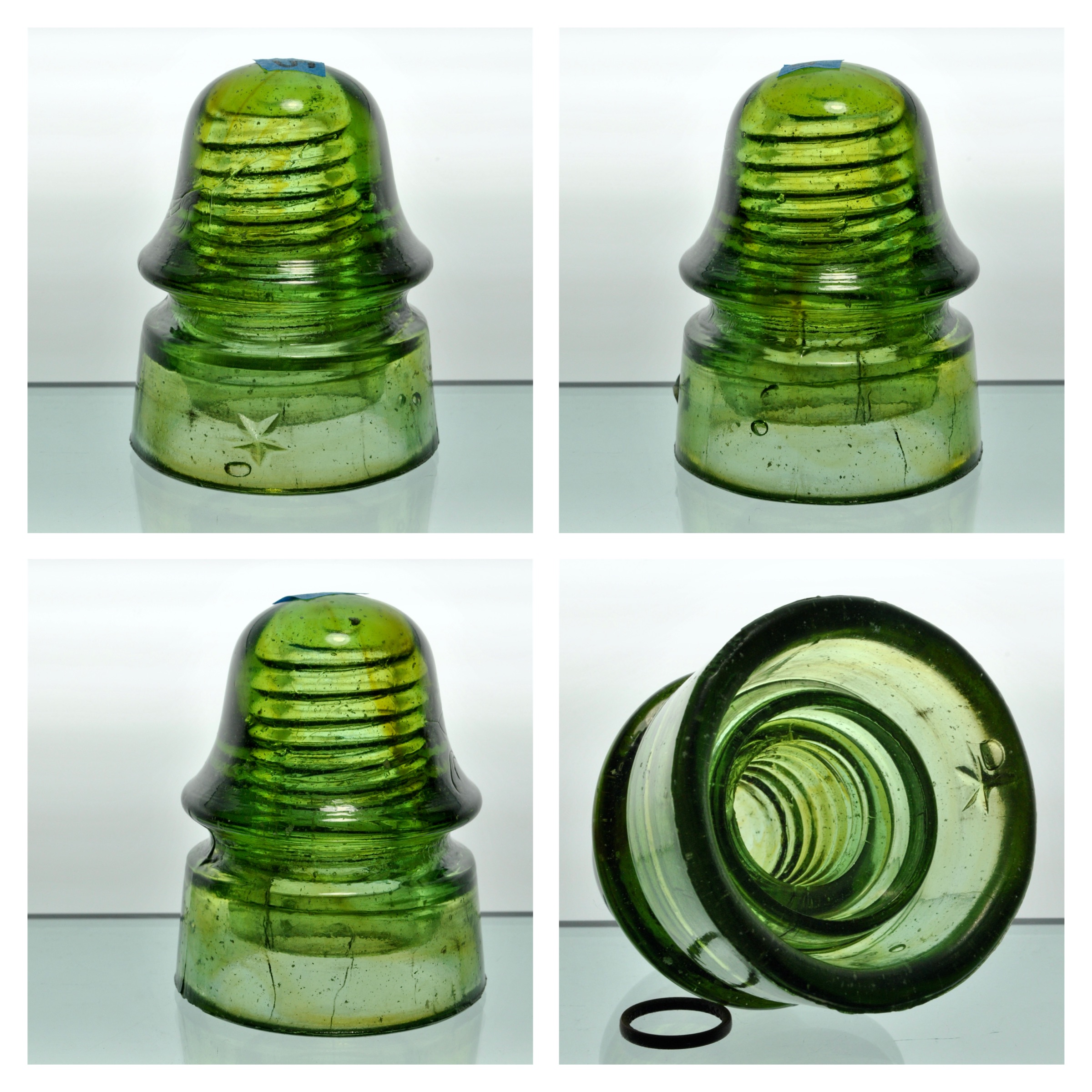 This is just a beautiful insulator. This one has it all; great color, snow, amber which gives it a variegated color and in amazing VNM (very near mint) condition. There is a small area of nibbling at the pin hole and a tiny flea bite on the upper wire ridge at the left mold line. Take it for $50 to include shipping If you live in the USA and west of the Mississippi River and $55 if you live in the USA east or north of the Missisippi river. |