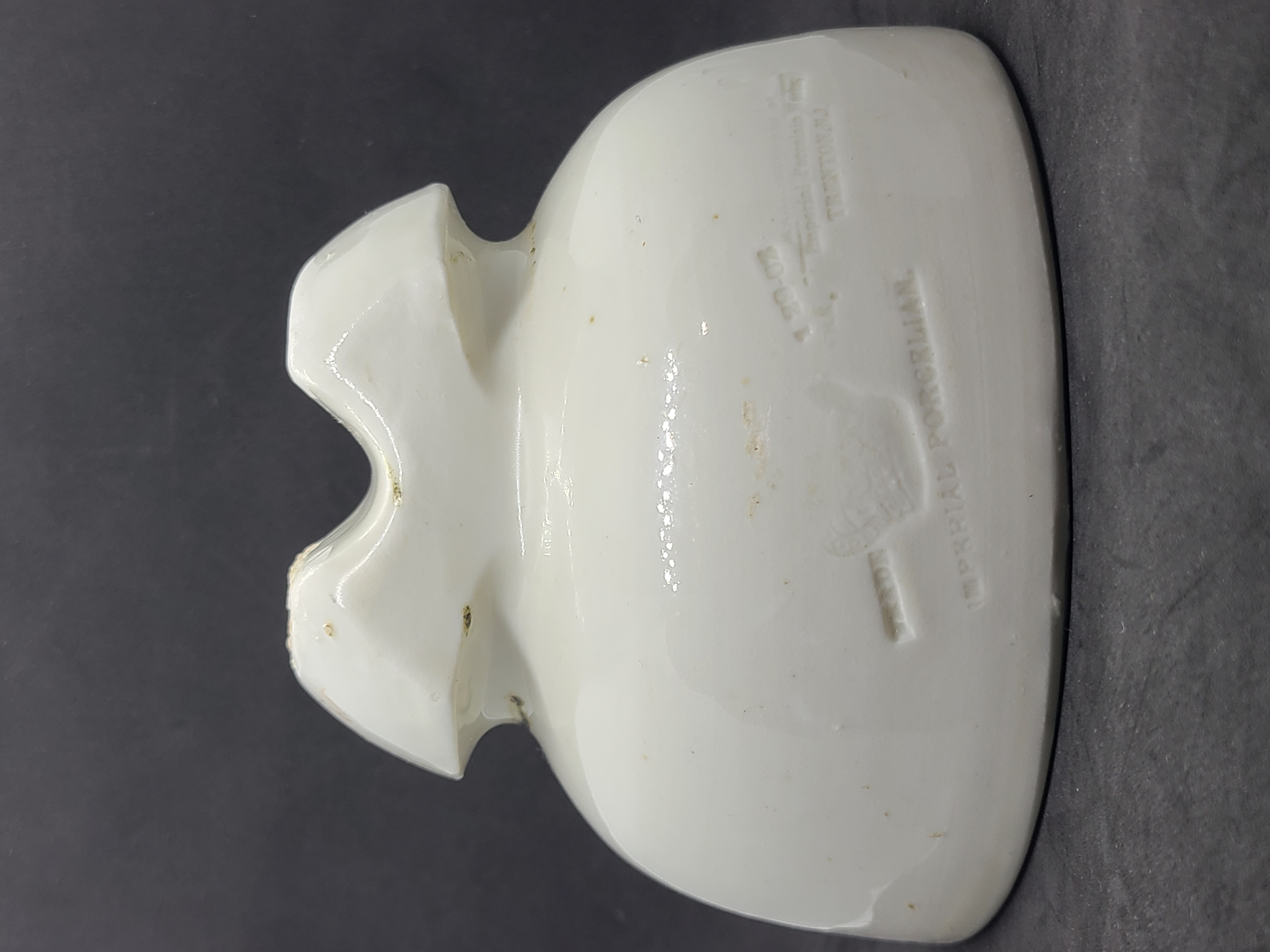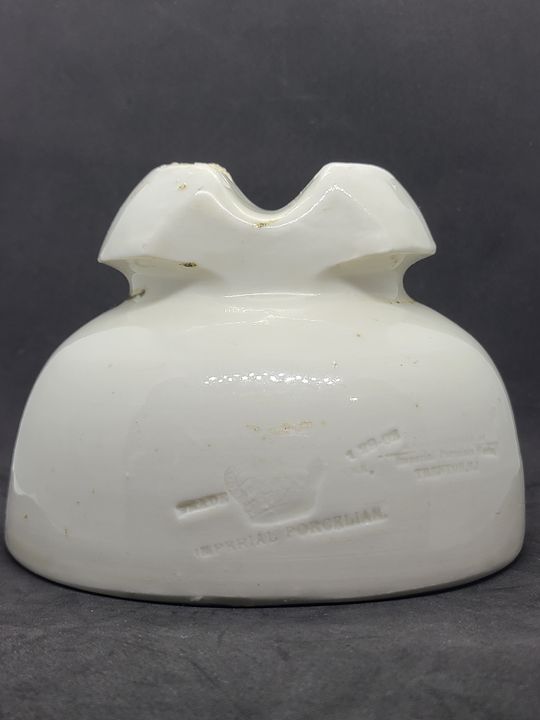 Cool old classic porcelain with a spelling error. Porcelain is spelled "Porcelian". Two flat flakes (smaller than a pinky) off the side crown at the top of the wire groove, harder to notice with the white glaze. Asking $60 plus $12 for shipping.