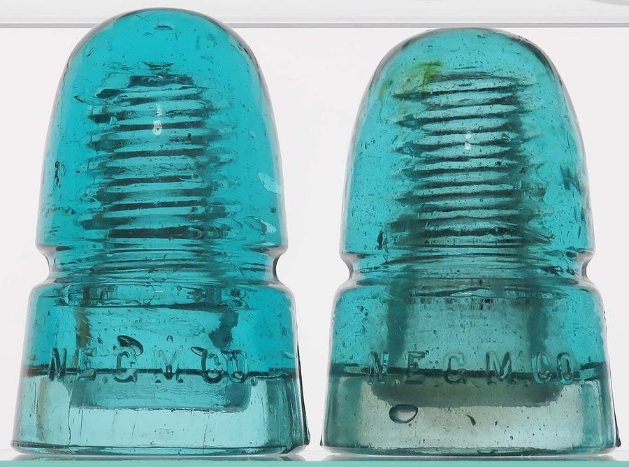 Insulators as follows - actual postage additional: CD 145 N.E.G.M. -- nice blue shade - tall, thin version with good dome glass -- VNM -- $15 (SOLD) CD 145 (dome) "interesting circle pattern" (skirt) N.E.G.M. -- aqua with lots of tiny bubbles and tiny amber - BB ding on back and a couple base flakes -- $8 |