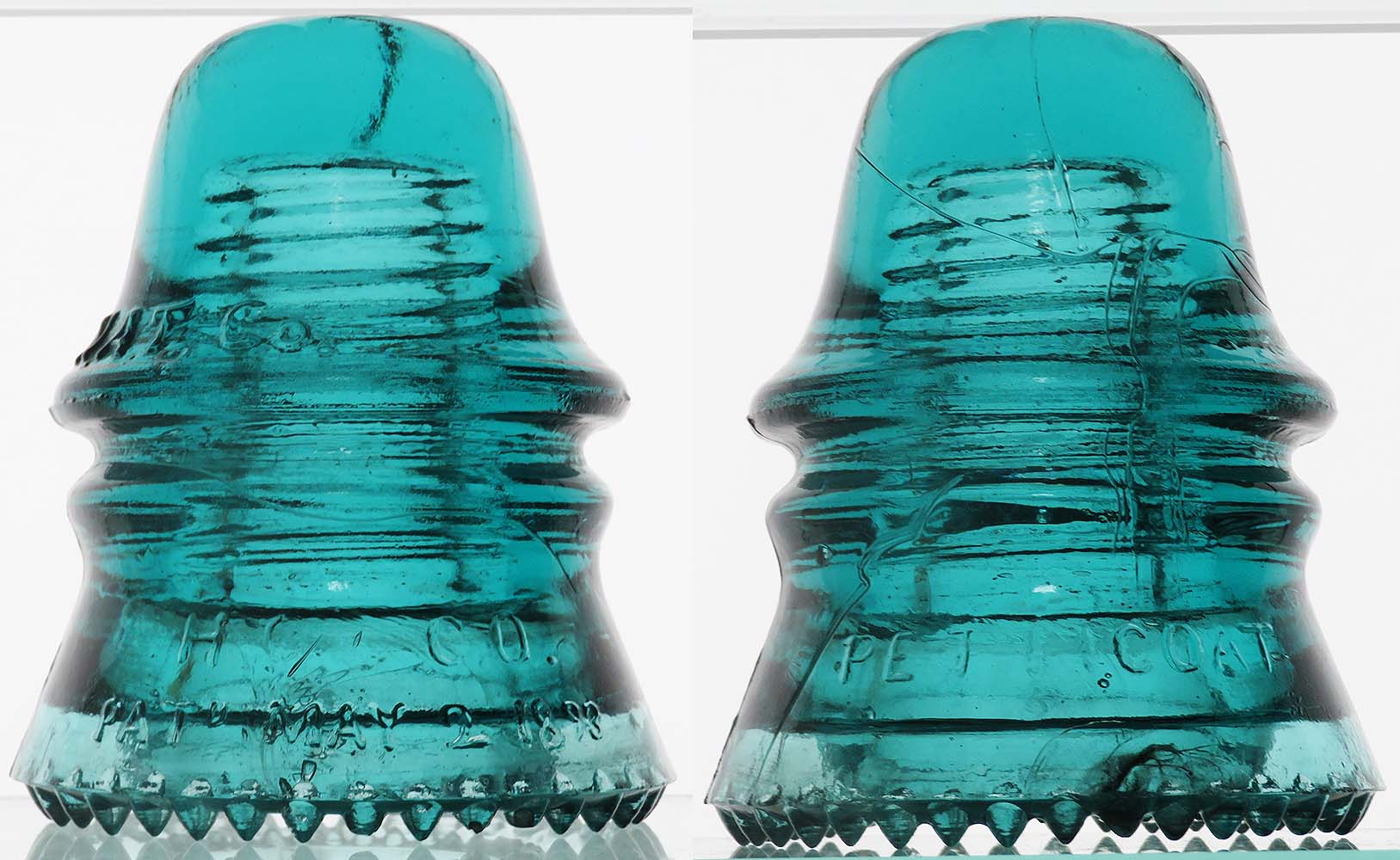 CD 151 (dome) N.A.T.Co. (skirt) H.G.CO. / PATD MAY 2 1893 // PETTICOAT -- The randomly placed N.A.T.CO is nicely over the H.G.CO. marking! These aqua examples are likely as scarce as the peacock versions! Base bruise on back affects three drips with one partially flaked drip - displays great. $45 plus actual postage. |