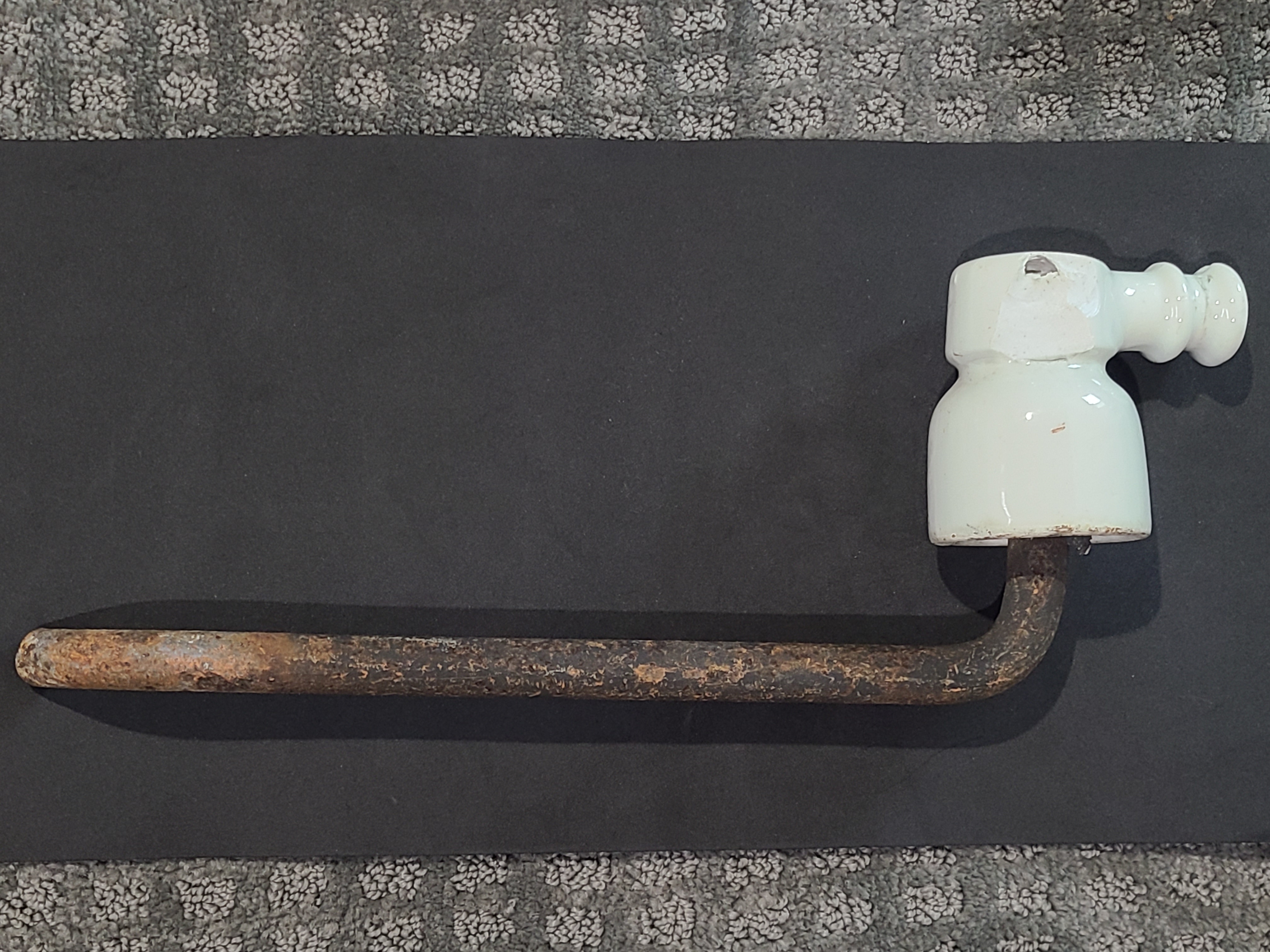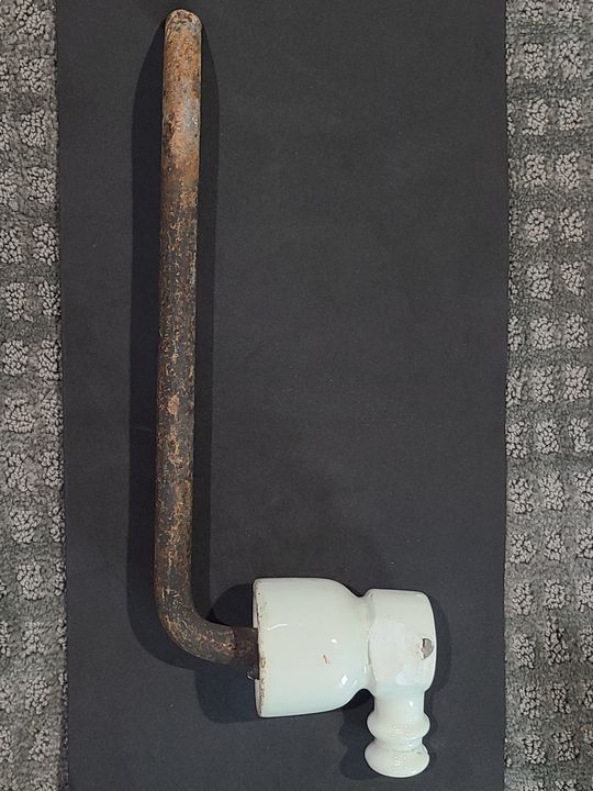 Neat noser found in France, still on the original pin. There is a large thin chip that can be seen in the photo, the otherside displays well. Little flake off the nose and the inner skirt has split due to the metal pin expanding. I don't see any markings, but crude mold lines and older pin, maybe 1920's or older. I can send more pictures if needed. Asking $15 plus shipping. |