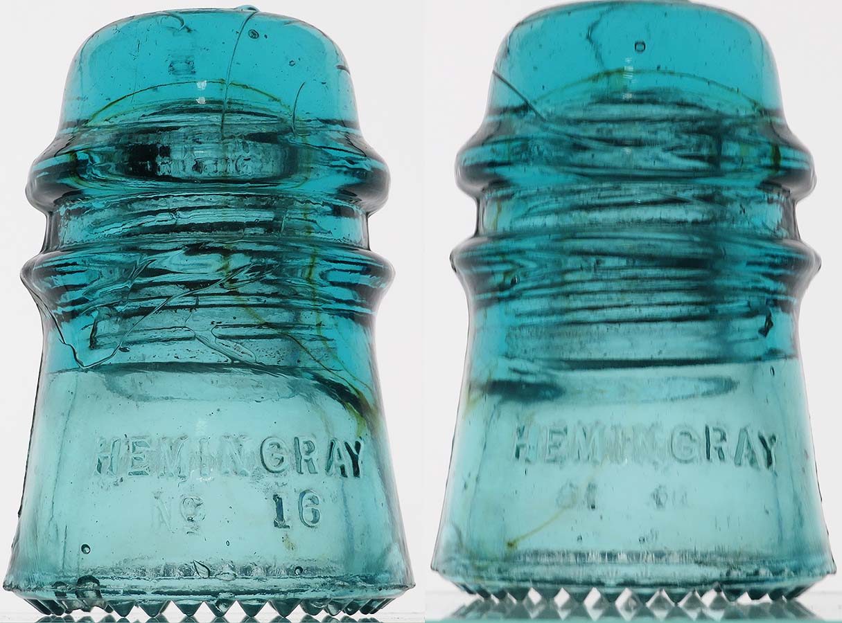 CD 121 HEMINGRAY / No 16 // HEMINGRAY (dome) "large 1"-- SDP -- aqua with some nice amber wisps -- just 4 partially flaked drips and a small rub on the side -- $5 plus actual postage