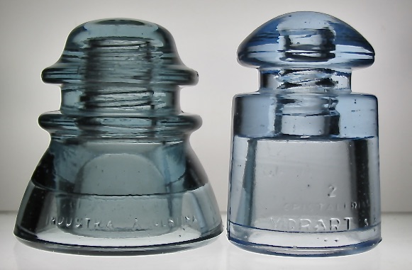 Here's a pair of special blue insulators from Argentina. The CD 154 Vidrart (left) comes in an unusual Smokey Blue color! Embossed Cristalerias (faint) Vidrart SA//26//EN TeL A17 (front) AISLATRON//INDUSTRIA ARGENTINA (Reverse) and 32 inside the top of the pinhole! VNM shape with 6 small tic/ping marks. No chips or cracks. First email gets this rarely offered color for only $100 plus shipping. The glowing CD 128 Vidrart (right) comes in a brilliant Cornflower Blue! Embossed 2//Cristalerias Vidrart SA//Dot Dot (front) TE AI 23//OTALOGO AR. VNM+ shape with only a light scuff mark on reverse and a tiny tic mark! $250 plus shipping. Buy them both and I will offer free shipping and $25 off! I've done some research on the company that made Vidrart insulators and discovered they did some joint production of glass items with Wheaton glass company! This could explain where they got the fabulous color formula for their Cornflower insulators! First email gets them! Thanks! |