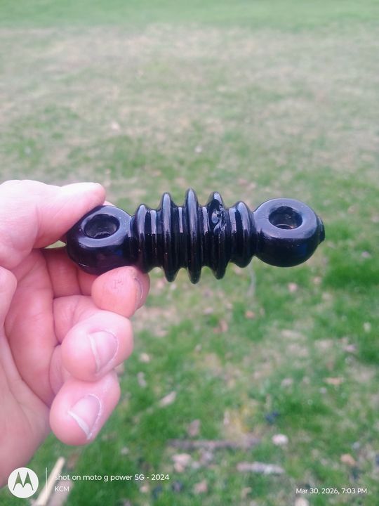 An extremely dark green black glass radio strain insulator here. Has a single shallow rib chip to one side and 3-4 needlepoint pin pricks. Shows the green color in bright light and the chipped side is shown.