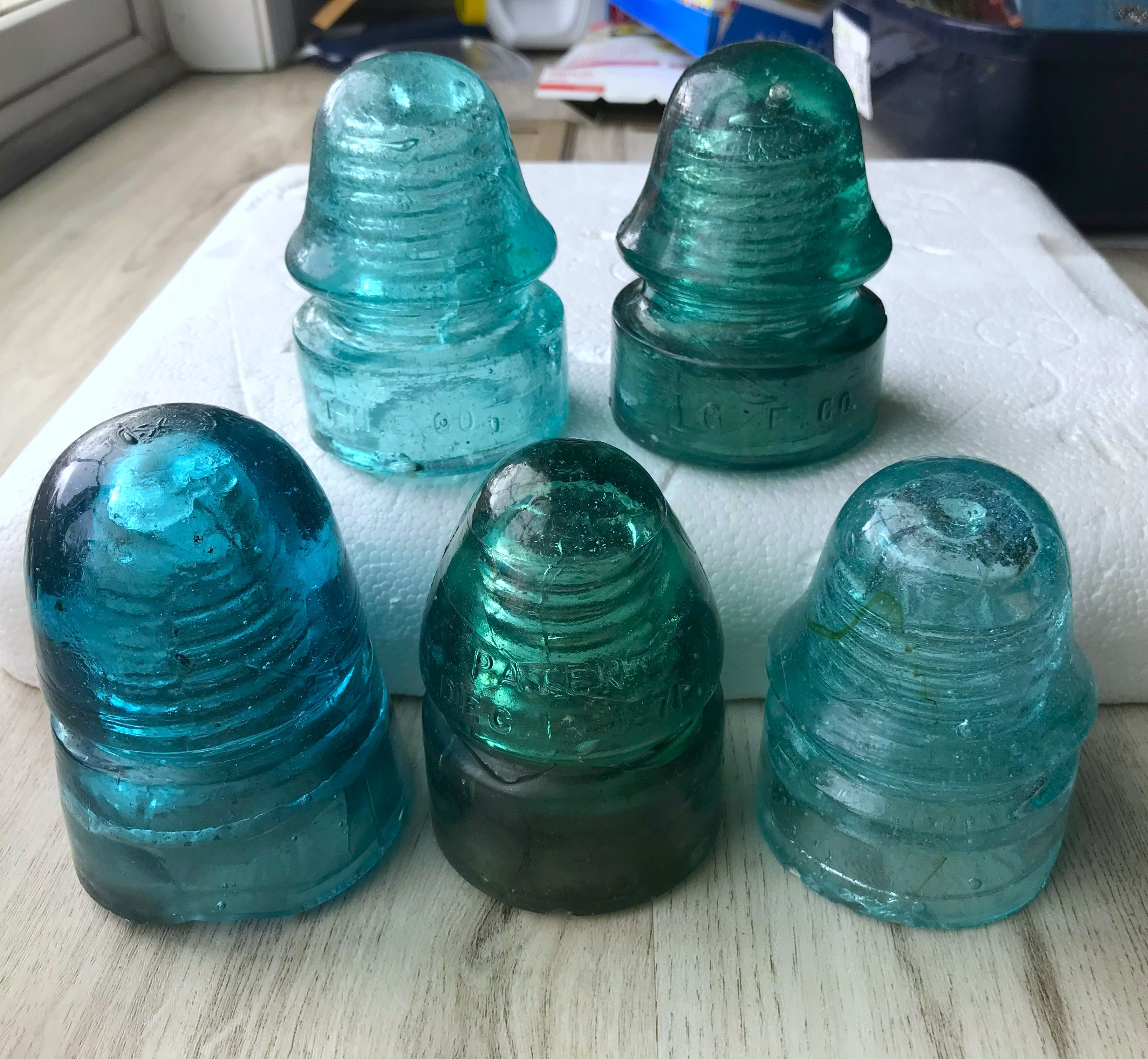 GE, THE, American-Signal, vivid blue American beehive and Dec-Pat 133.1(?). All have a small chip or something, but the 134 American has two larger flat base chips that remove some of the embossing. $80 for the group and free shipping.