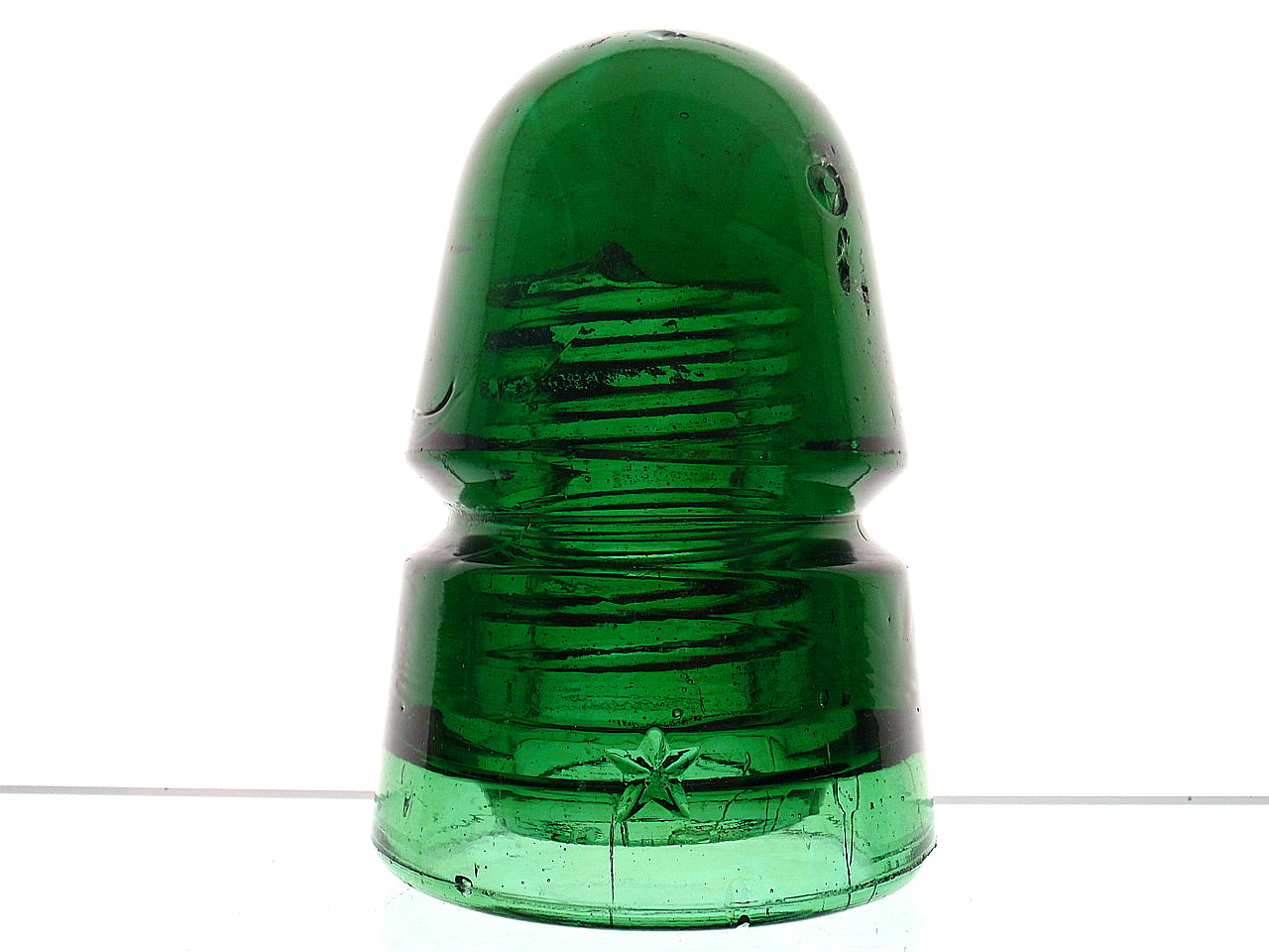 MASSIVE DOME GLASS! 1 5/16" of solid amber swirled dome glass on this dark yellow green "Postal" style STAR beehive. Nine scattered pencil lead point ticks, two small side crown lehr kisses and a side crown index fingernail bb shot bruise with a tiny flake out of the middle of it is the damage report. $ 135.00 includes shipping. |