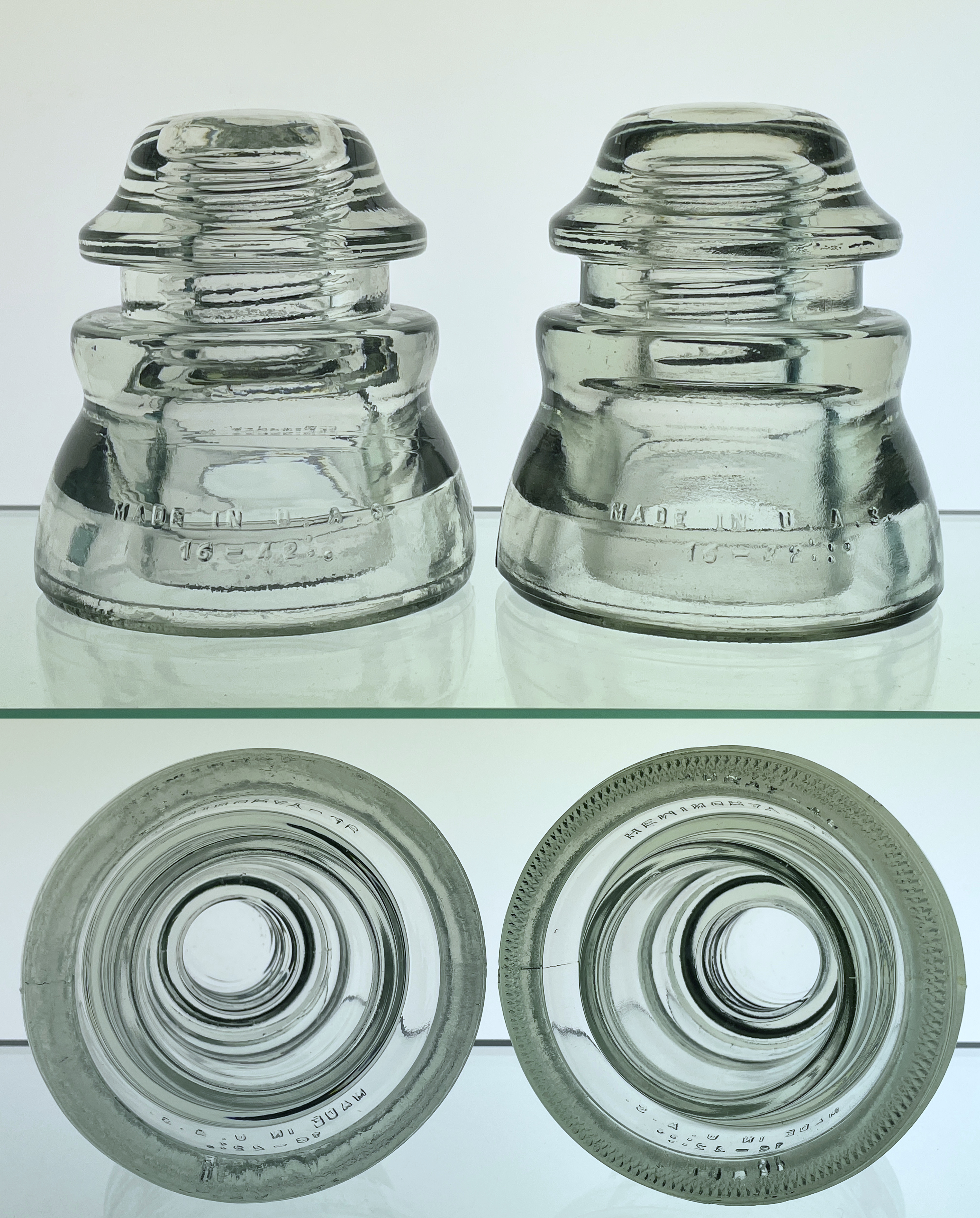 Currently unlisted CD 155 "MADE IN U.A.S." error. Similar to [020] but with corrugated base (CB) rather than smooth base (SB). Left: [020] SB version in clear (16-42:. = 1945 production). Right: Unlisted CB version in light straw (16-42::. = 1947 production). |