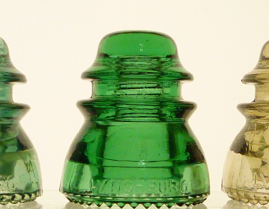 USED CONDITION. CD 154 LYNCHBURG // NO 44 telegraph insulator. Front skirt: LYNCHBURG Rear skirt: MADE IN NO. 44 U..S.A. Sharp drip points.....ALL INTACT. Nice bright YELLOW GREEN. Super nice condition. No other distractions to note. Never a need for an upgrade. Has been in my personal collection from the 1970's. $80.00 + shipping. Stock #a4178) |