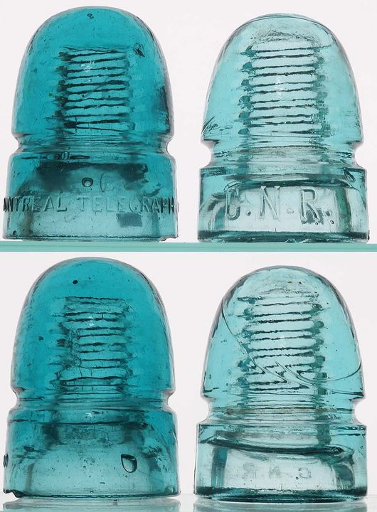 Insulators as follows -- actual postage additional CD 143 MONTREAL TELEGRAPH // CO {MLOD} -- grooved base -- nice blue -- 1" area of flaking at the sharp base edge on the side and a small base bruise (see photo [id=780083785]) -- $25 CD 143 C.N.R. -- light aqua -- tiny flake under "R" -- $5 |