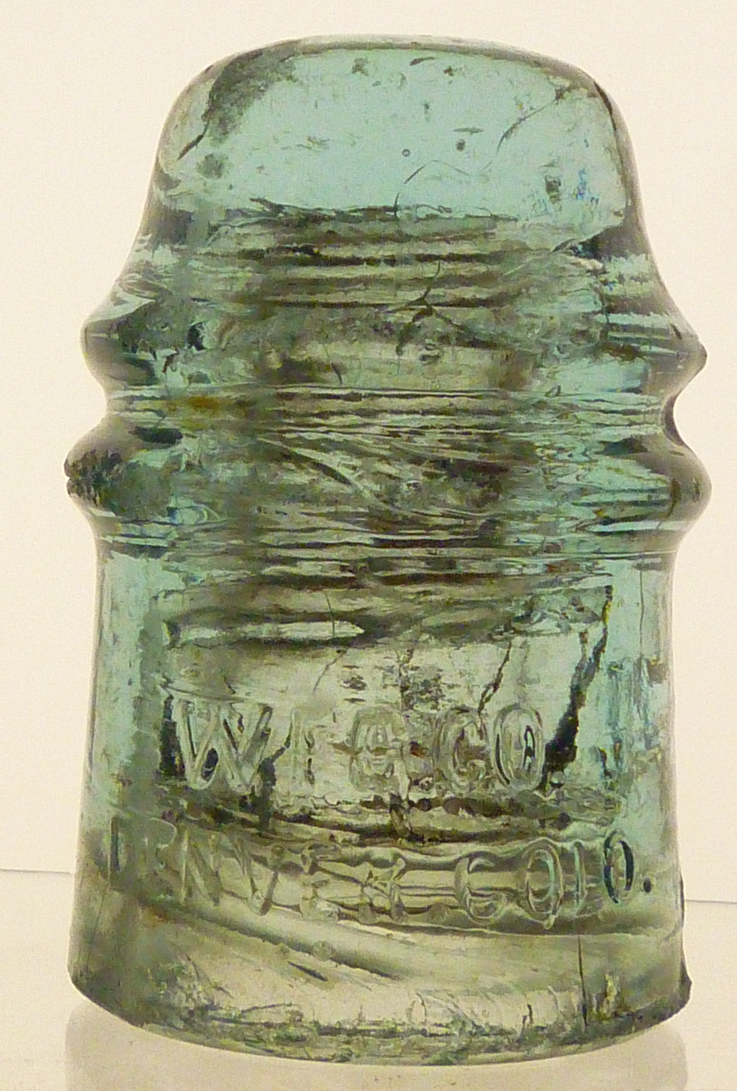 USED CONDITION: CD 121 W.F.G. CO. toll line insulator. Front skirt embossed: W.F.G. CO. / DENVER. COLO. / .. Rear skirt embossed: 16 Smooth base. AQUA. Condition: UNIQUE !!!!! Meaning to say. " ain't another one exactly like this one." Overall nice, but visibly has been used. "Rode hard and put up wet as they used to say:" Notice that near the base on the inside of the skirt. It almost appears to have some sort of "swirl lthread marks on the inside edge". At the factory the threading mandrel could have done this either going in or coming out. Some nice annealing cracks in the threads. There is about a 1" gap from the actual threads starting and the ones in the lower skirt. Nice and crude. Has some rub marks on wire rims. A vertical rub mark on the front from dome down to te the base edge of the skirt that is about 1/4" wide. Some small pecks . Base is nice with no distractions to note. 100% positive this piece has been used. Not sure as to what/or who caused the other mentioned damage. Top of dome shows signs of "frit" or other material falling into the mold before the glass was poured, Some surface annealing lines. Cannot be described as "MINT", "VERY NEAR MINT", OR EVEN "NEAR MINT". No conditional description will cover this piece. No need to send to a 3rd party " grader " for advice............This piece stands all alone by itself as...... UNIQUE With this piece in your collection, you can feel 100% confident that no one else has one like it and that there is not another one to be found. Stock #a4179 $100.00 + shipping |