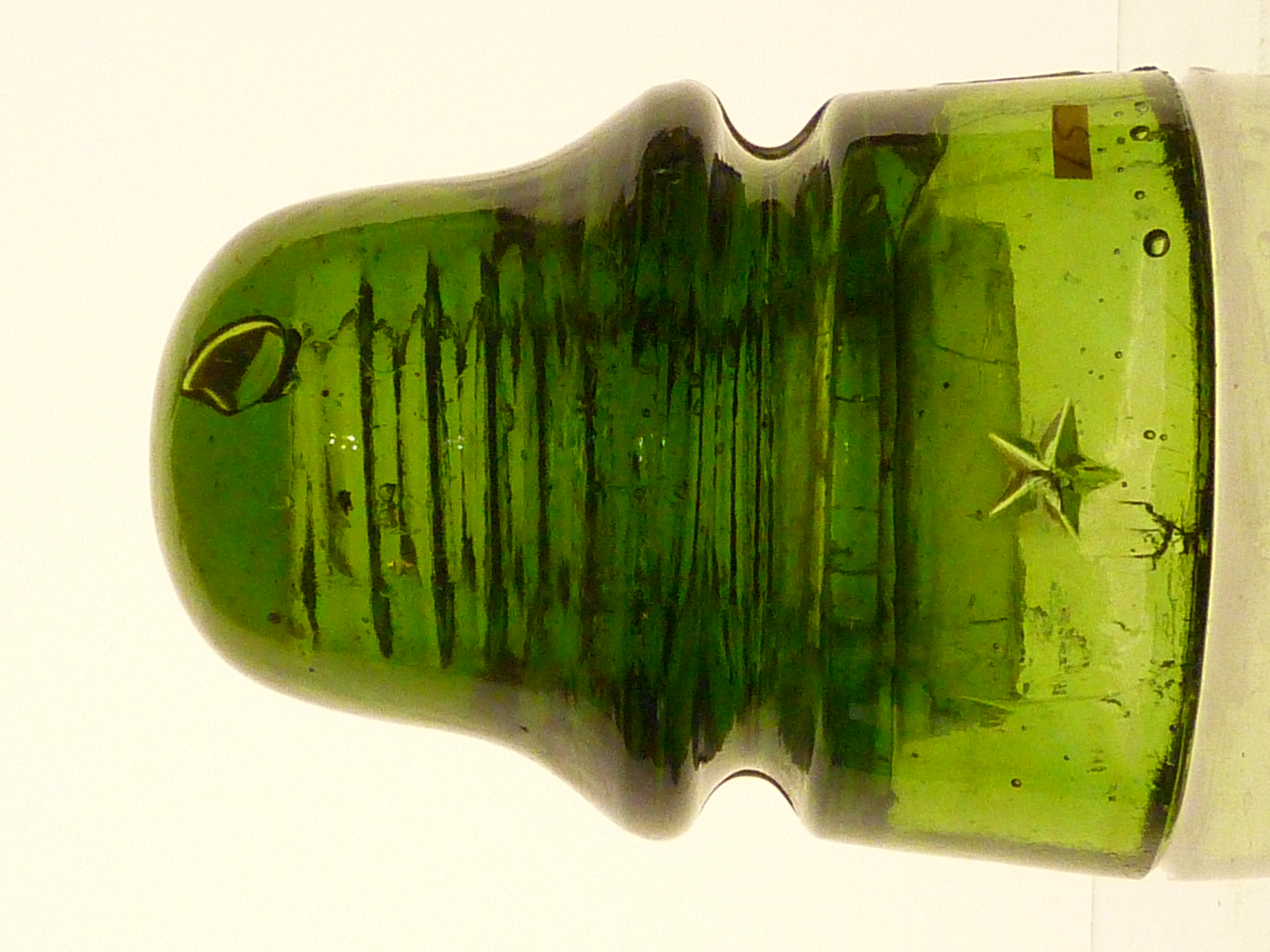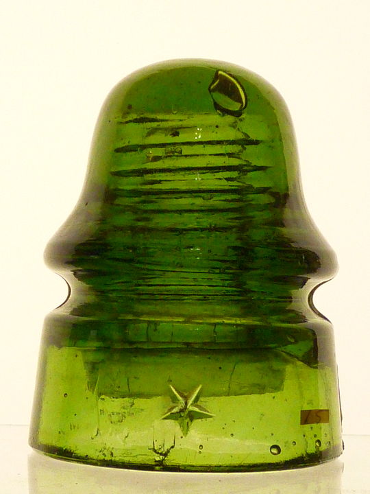 USED CONDITION CD162 STAR signal insulator. Smooth base. DARK OLIVE GREEN. Nice overall condition. No distractions to note. Has a vertical bar on inside edge of skirt behind the STAR. ELMER ring at top of pinhole. Super nice color. Bubble in dome glass. $30.00 + shipping Stock #4183 |
