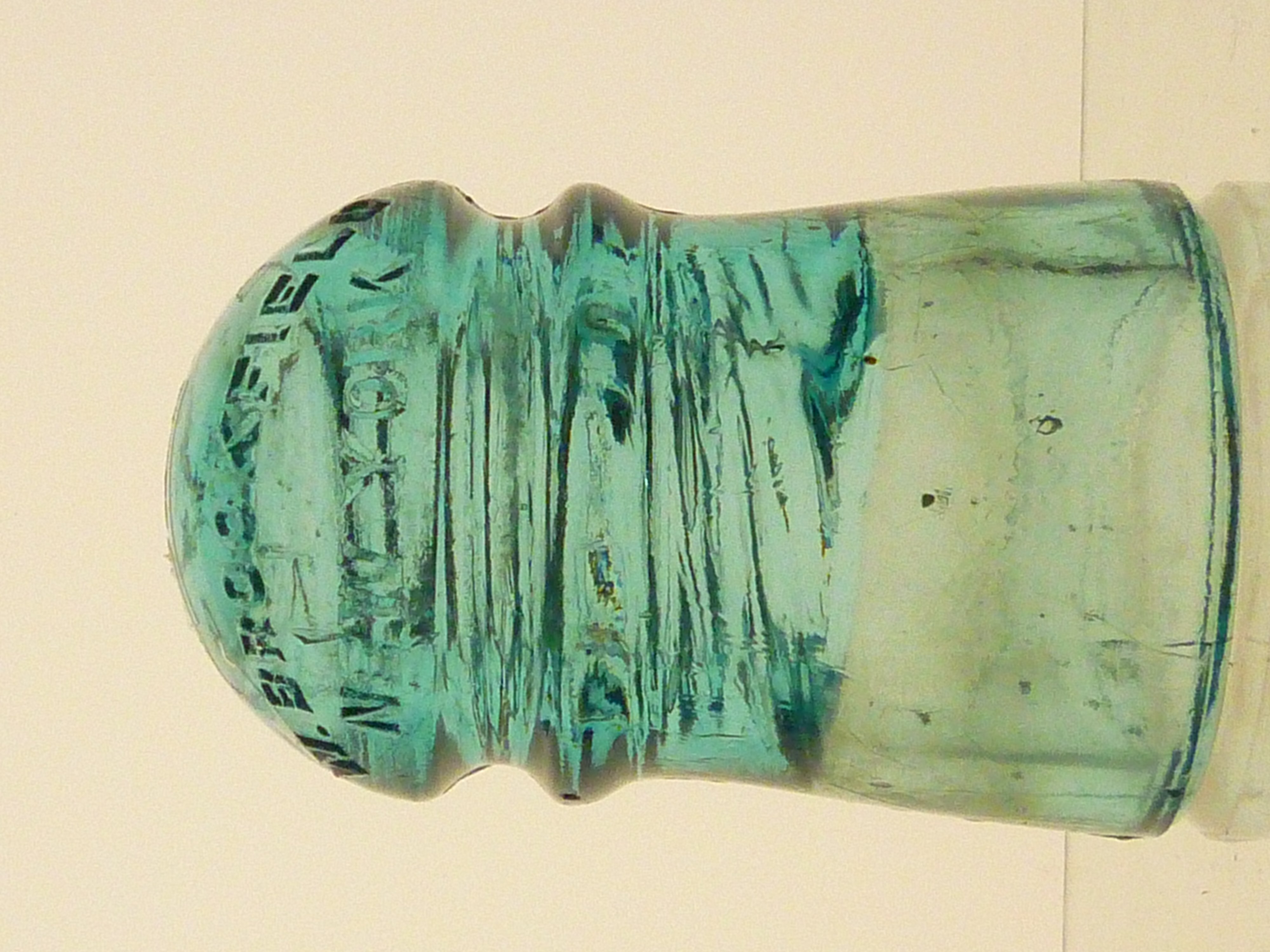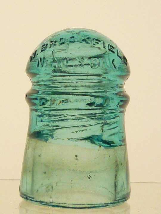 USED CONDITION CD102 Crown embossed BROOKIELD pon insulator. Front crown embossed: (arc) W. BROOKFIELD / NEW YORK Rear crown embossed: C Smooth base. AQUA. MLOD. Very nice overall condition. One of two tiny " pings " on the dome. No other distractions to note. NICE BOLD EMBOSSING !!!!! $10.00 + SHIPPING Stock #a4184 |