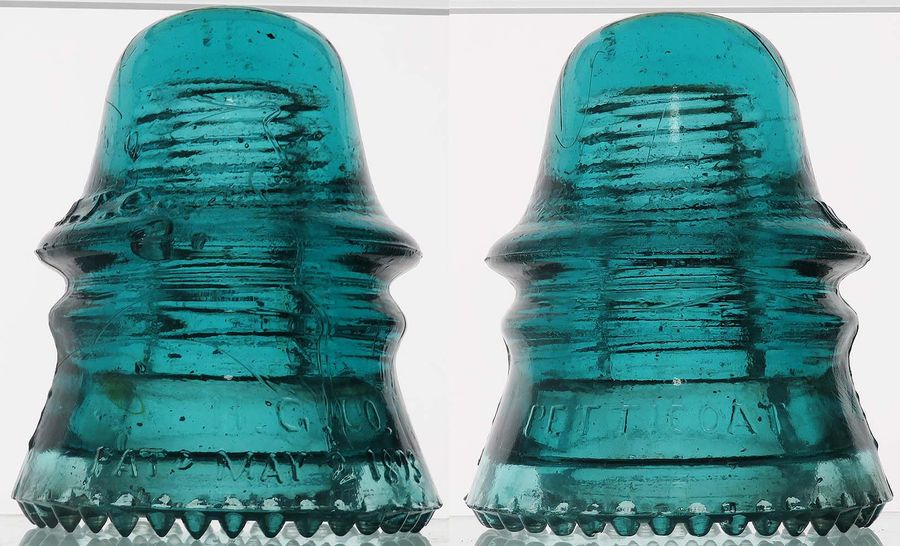 CD 151 (dome) N.A.T.Co. (skirt) H.G.CO. / PATD MAY 2 1893 // PETTICOAT -- These aqua examples are likely as scarce as the peacock versions! Nice condition with two nicked drips and a flat flake under the upper wire ridge on the side - $50 plus actual postage. |