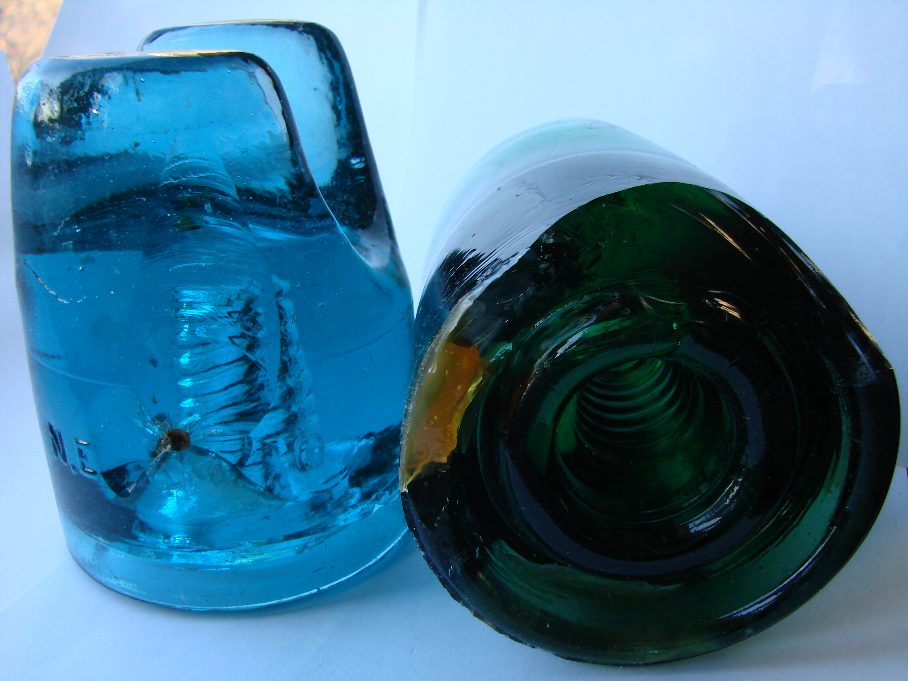 The Blue piece has a potstone fluted flake up the side. The Dark Yellow Green has 1/2 skirt damaged in back; a gob of resin helps protect fingers from a sharp edge. Rare colors.