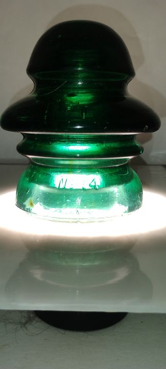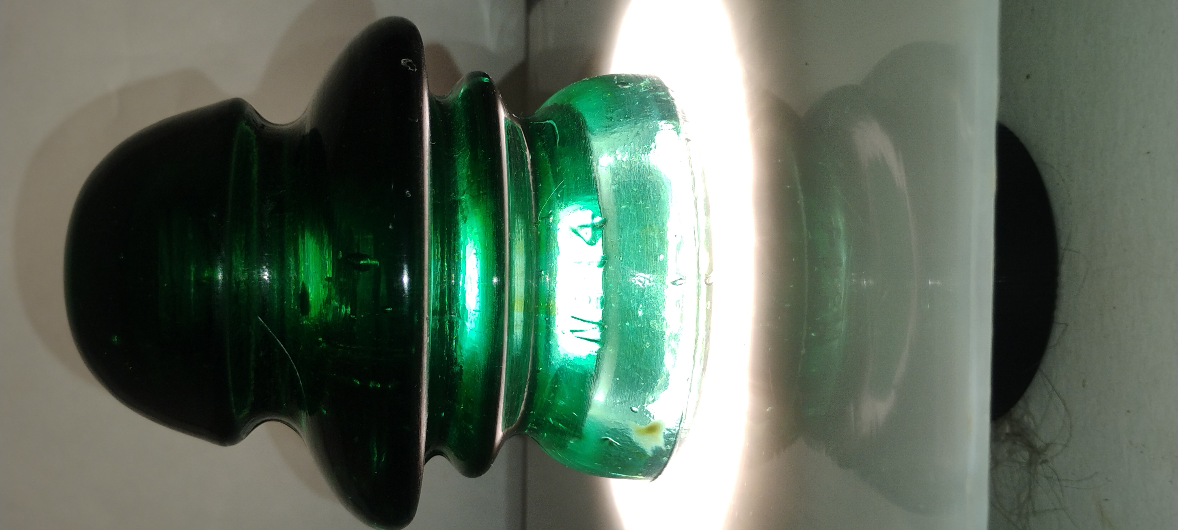 No name transposition, emerald green, no defects, embossing on lower skirt No 14, underlit to show darkness of color. Book says $75 to $100. This piece could be called green black glass. $75 PLUS shipping of $12.