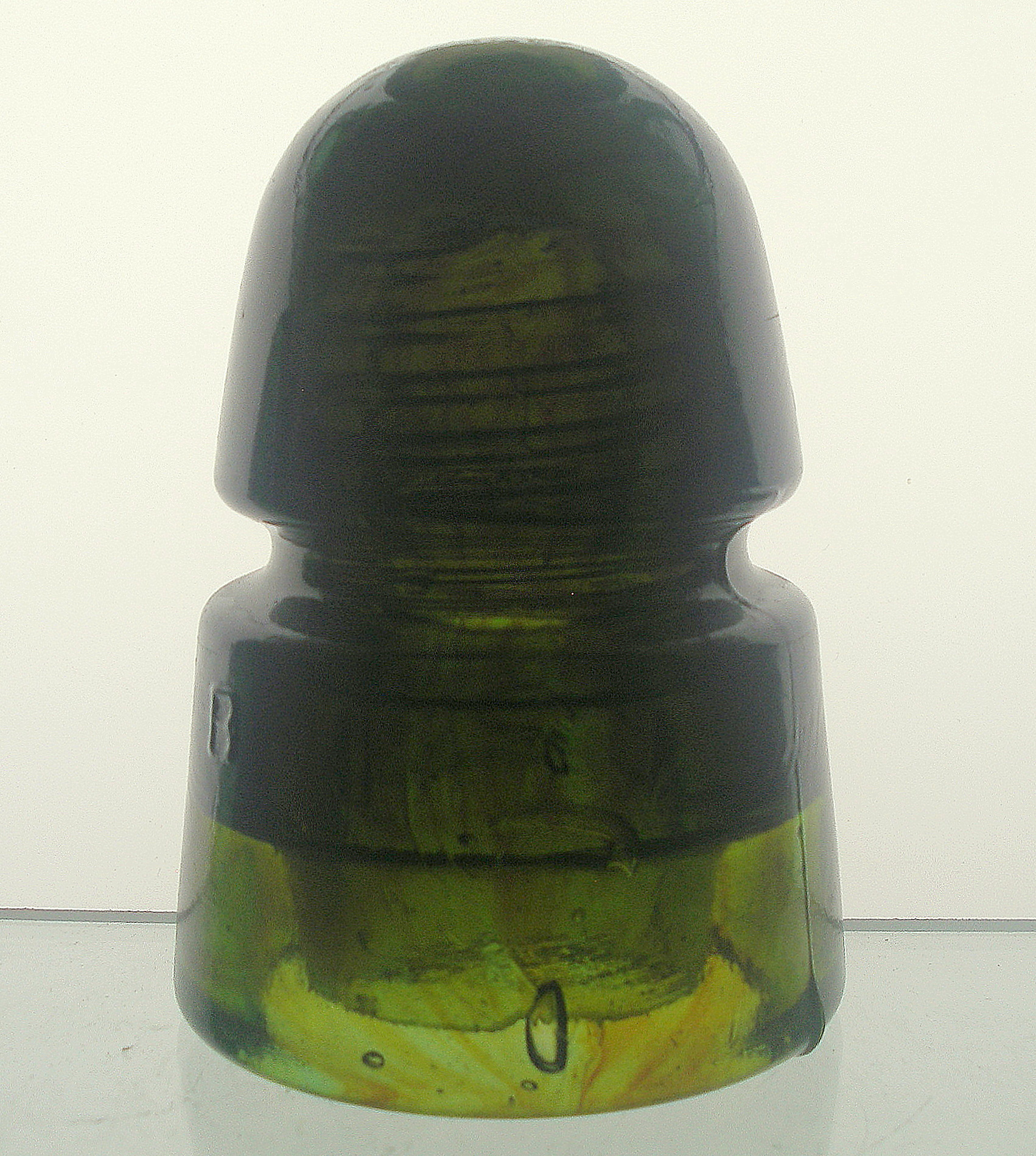 Offered up here is an AWESOME TIGER STRIPED Olive Amber Beehive glass insulator made by Brookfield. This piece has copious amounts of amberation and stripes throughout. Pictures do it NO justice! Besides the striping, there are some cool bubbles encased in the glass. Condition is pretty much MINT. There is a tiny pinprick on her dome and her inner skirt has what looks like a small underpour. There is also the ever present in these units annealing fissure on her inner skirt. Asking price of $320 includes shipping. Add this ICONIC insulator to your collection today! |