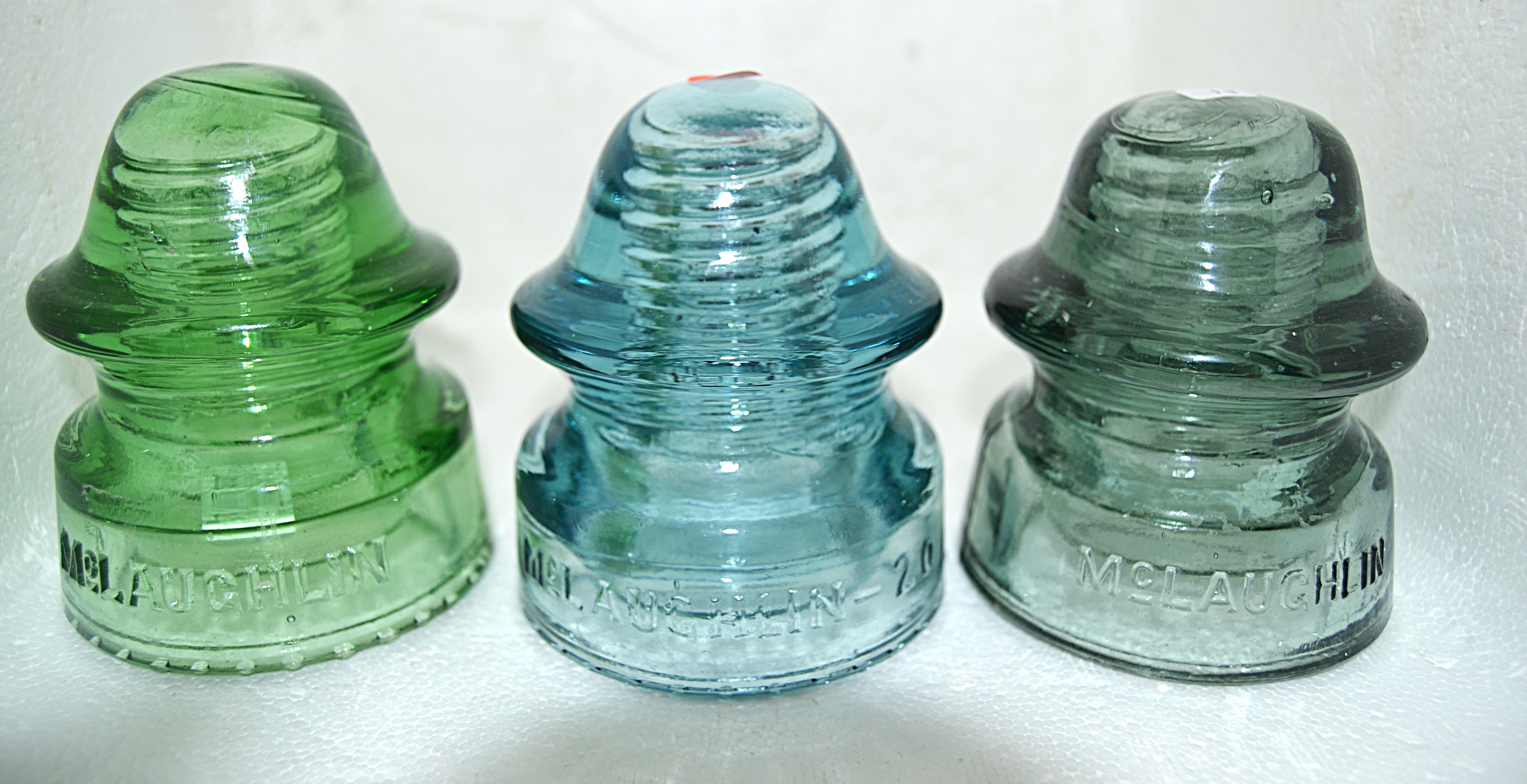 Left embossed McLaughlin and on rear skirt NO-20 - Round to sharp drips - One drip on back partially flaked and a mold defect on front dome. - Calling the color Apple Green - $40 --- Middle embossed McLaughlin -20 - Small round drips - See no flaws - $50 --- Right embossed McLaughlin NO 20 - Smooth base - Steel Blue - small area of roughness on top wire rim 18 plus actual shipping costs. |