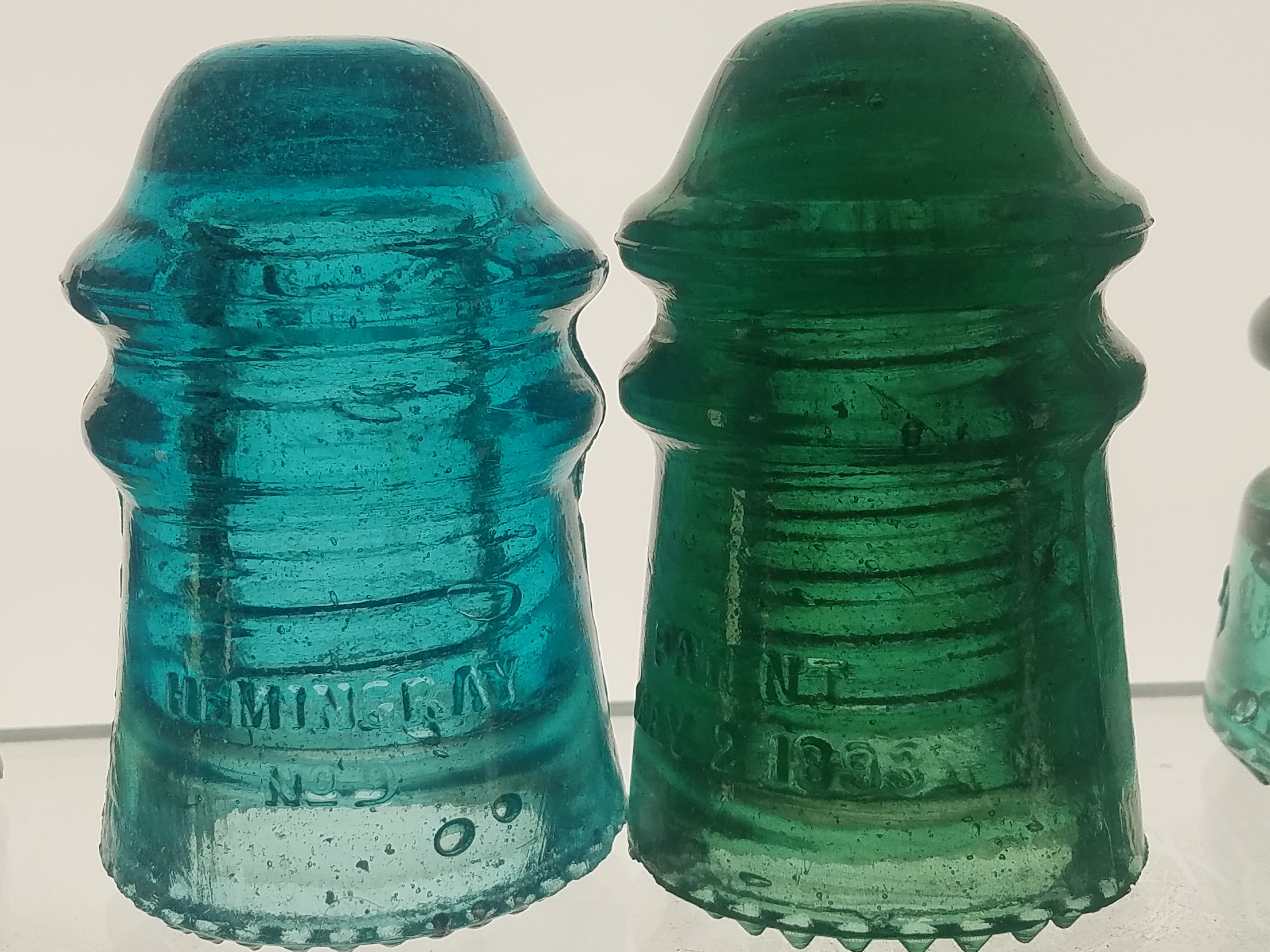 i knew i had several insulators in the acid bucket cleaning. been there since last fall. so long that i don't remember where i got them. But sure a nice surprise when i pulled these 2 out. Both are non stamped. green one has milky stringers running up side, over top, back down. picture does NOT due it justice compared to holding it in your hand in sunlight. Enjoy. |