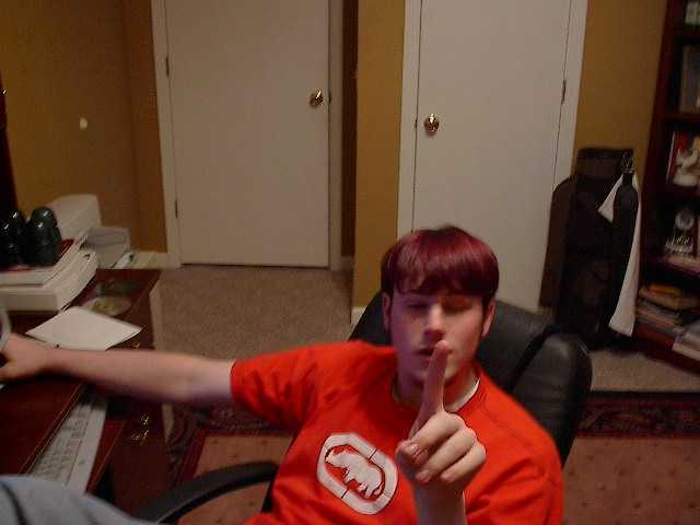 Here's a picture of me at the computer desk in the office. It's me telling Bethany not to take a picture. She doesn't listen very well. Try to Enjoy.