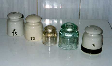 Telephone insulators from Italy. All FT 92 but the small one (FT 70). Manufactured by (left to right): RICHARD GINORI, EB, MIVA (glass ones), RICHARD GINORI. These have been for years, the most common types of telephone insulators used in Italy. [IFONA GROUP] |