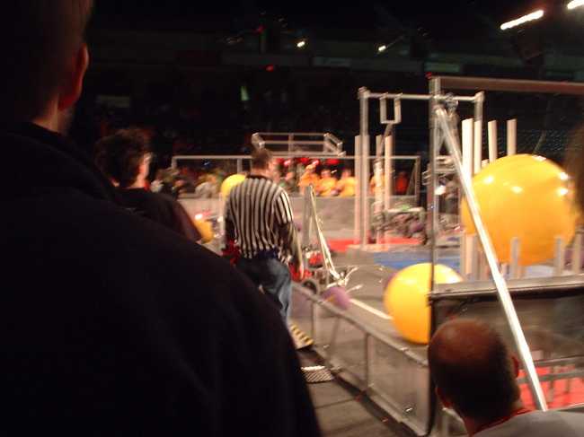 I was also at the St Charles robotics Competition, on team 1028 ( i was the guy walking around the whole place with our team buttons all over me giving em out and also had the speakers taped to my shirt ) here we see our bot (right next to the ref)