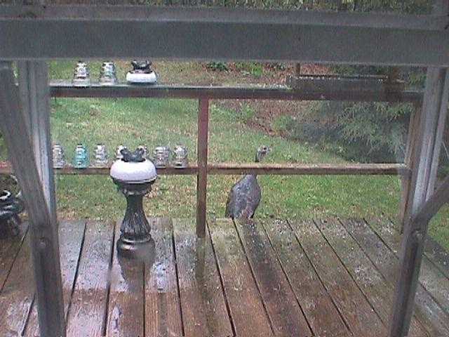 Saw a wild turkey picking at the "fallout" from the bird feeders, thru the kitchen window. Picture quality isn't all that great, but then I was shooting thru 3 layers of glass, and it was drizzling. I was about 12 feet away in the first shot.