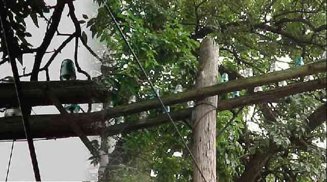 I spotted this pole in Lexington, KY., next to a working RR track but out of the way enough where a person could climb up and get some of these. Lots of clear 42's or 45's but 6 to 7 interesting beehives...maybe!! The photo shows a closeup of the beehives. |