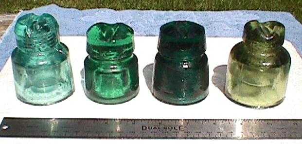 I've been accumulating some Russian glass insulators during the past several months. I am not sure of the CDs of these four. The two in the center have very thick skirts, the 2nd (green) is weakly embossed B C 3 (Cyrillic V S 3) and has a small "bulls eye" incused on the crown. The other three are unembossed. изоляторы poccии [IFONA CD 568.x ???] |