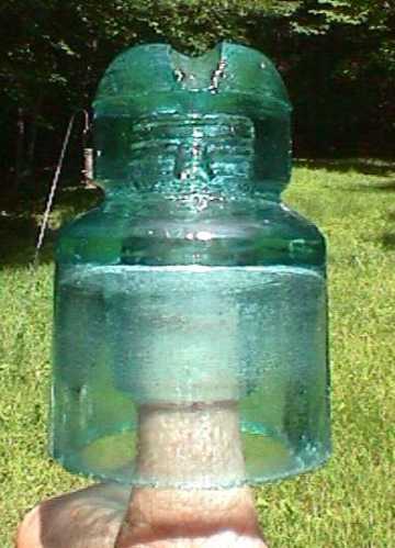 Small aqua Russian insulator, no embossing. Note the "divot" at the top of the wire groove and below the upper saddle groove. This is not a chip, there is an identical "divot" on the opposite side. Perhaps these accommodate some form of locking device? This may also be from Poland, as there are some that resemble this, and it may be a CD 579.5 [IFONA CD ???] |