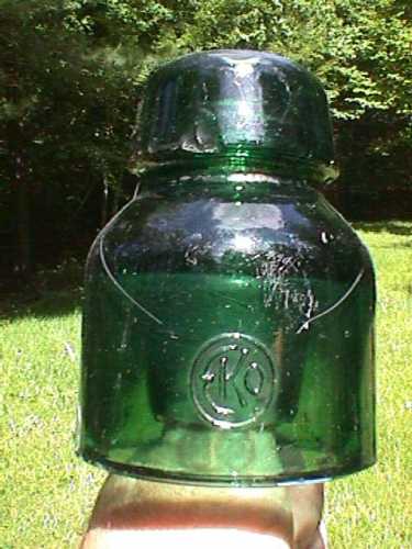 Green Russian (?) insulator, embossed "EKO" inside a circle.
