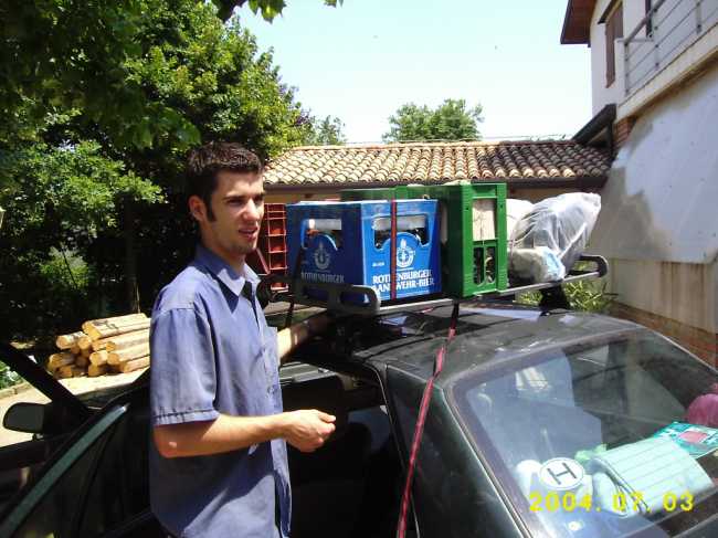 The roof of the car with boxes full of Insulators. There is my friend who is the driver.