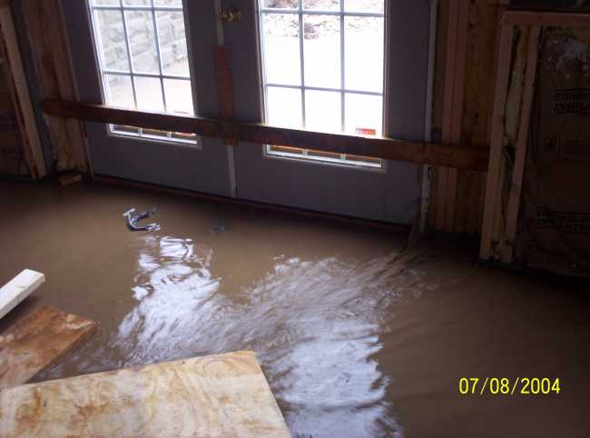 I work on building our new house and one day we got 3 inches of rain in 30 min and someone didn't drill holes in the outside drains so it backed up. Well this is the basement filling with water. There was so much water it kept breaking all the 2x4 we nailed in front of it, this picture was taken a few min after the rain. There was 3 ft up against the door. Took 4hrs to clean up. |