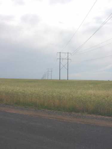 This is the main feed close to the line drop and switch. Just behind the camera, one set of 3 wire goes to a rather specialized switch pole, while the other 3 go on past on another specialized through-pole. See Shot 1 for details.