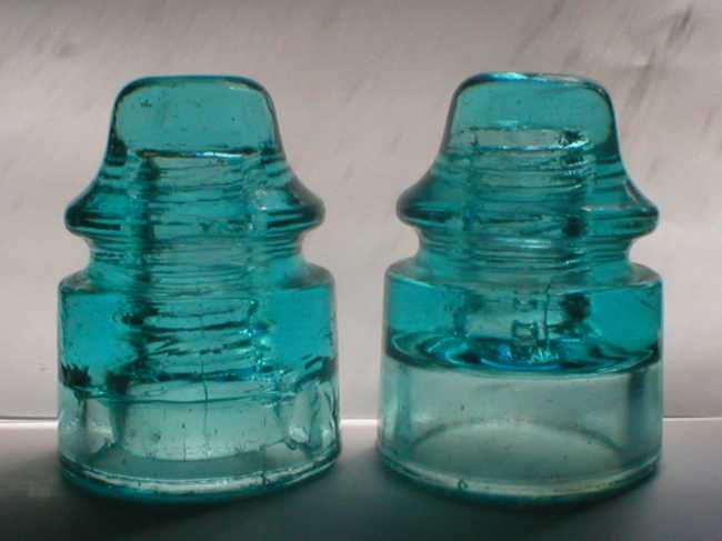 Shown respectively are the two known "signal" styles made by The Standard Glass Insulator Co. Boston. Joe recalls quite a few of these insulators strung upon Boston (MA) Fire Alarm circuit lines through the years. The first crop of them was liberated by him and Phil Harding in 1970. But that was the tip of the iceberg! The city system had them scattered all about their iron open-wire with other vintage aqua insulators including crown-embossed Brookfields in CD 133 and #134. There was very little clear glass! The Boston system was "picked over" through the late 1980s whereby very few if any Standard insulators may still remain (see note below). Of their pluckings in 1970, Joe and Phil soon found out that the inner skirt variety (CD 157.5) was far more common than the CD 138.2. In fact (Joe knew who the other "pluckers" were...no they were not from the Midwest!) and the latter style was found among a minority of the inner-skirt-less variety (CD 138.2). The ratio between the two was 8 to 1. (CD 157.5 to 138.2). Nearly all of the Standard's known have come from Boston. However it is known that electric utilities north of Boston have had them on their primary and secondary distribution circuits. In addition, Standard's were used on a municipal fire alarm system in Greenfield, MA (which is in the state's NW corner about 125 miles away). Nearly all are of a plain-Jane aqua but a few have been located in light ice blue (especially the CD 157.5). A further exception are a few in light green and these are of the aforementioned "signal" designs. Among the last-known installations of Standard insulators was along a two-pin Boston FD run through several backyards in Boston (1988). On each side of the backyards were fenced-off triple decker houses and in a tough neighborhood to boot! The insulators were mounted (2-apiece) upon buckarms (you linemen know that lingo!) making four insulators to the pole (there was just the one pole!). Since that location was inaccessible as described above and "protected" by man-eating dogs, a closer view was not possible. This incredible insulator-sighting was verified by one of Joe's collector friends who was working for the phone company at the time. And by binoculars! It is not known if this installation is still there. |