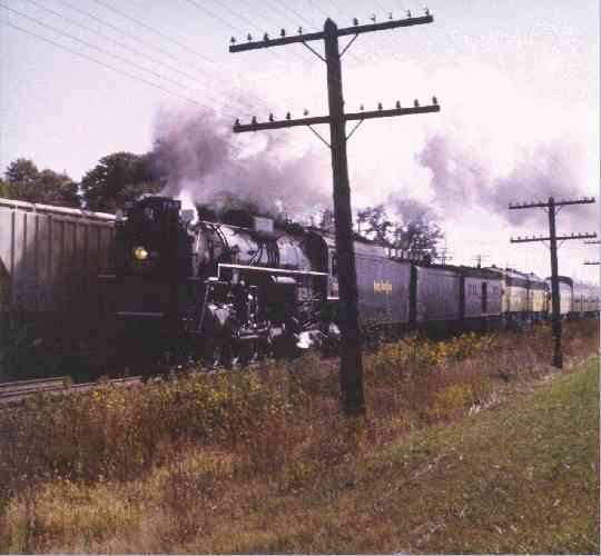 I took this photo back in the late 70's or early 80's. This Nickel Plate excursion train was headed West out of Geneva, IL on the Chicago & Northwestern line (now UP). This shows how insulators got so much soot on them. Unfortunately, the poles were taken down after the UP buyout. |