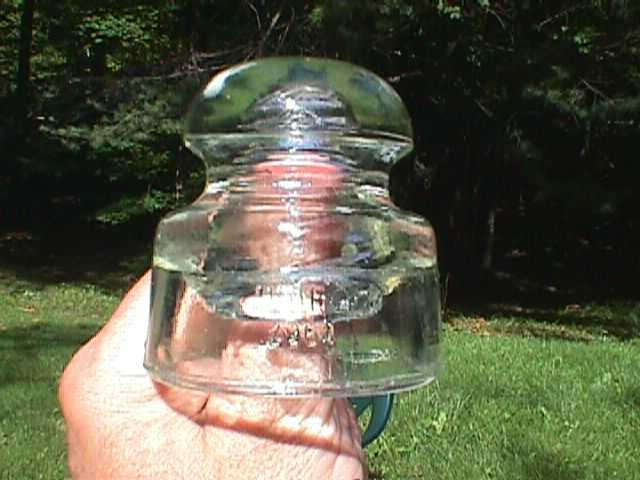 This little clear glass insulator is embossed with the Cyrillic letters ШЛНС-2 which are equivalent to Sh L N S - 2 over 1961. Base diameter 2 3/4 ", and 3 1/8 inch tall. CD unknown at this time. [id=99129832; Close up of embossing] This may actually be a CD 541.5 [id=293824615; compare with these two]] including a milk-white glass one! [IFONA CD ??? sim 459] |