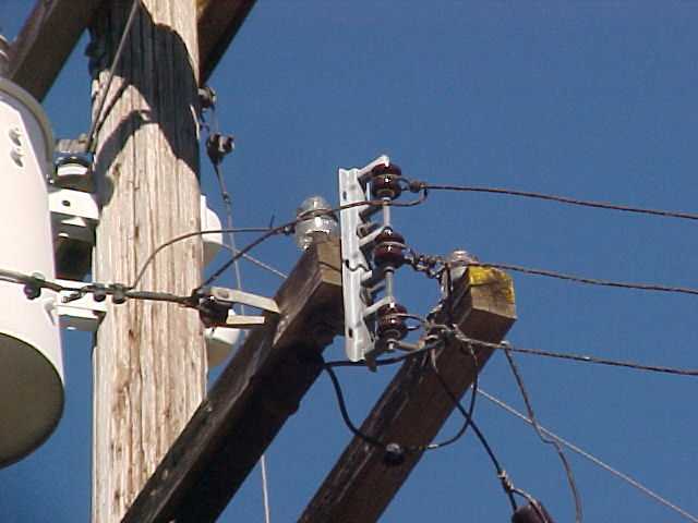 A closer look of the small secondary rack that one service is terminated on, the other one is dead ended on 500 Bobs (strain insulators). The secondary rack is attached to the insulator pin with 1/2" eye bolts. Note the broken primary down guy that's made up with the U clamps. |