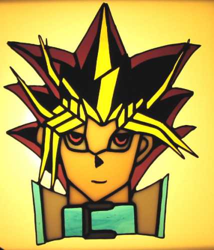 This next stained glass piece is a Yugi-oh character that I created for my nephew's birthday. I really enjoy creating my own patterns; that way I'm not constrained to the same old flowers and animals pieces that you typically see in stained glass art. I love doing the unconventional with the Tiffany copper foil method! |